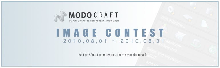 안녕하세요. 네이버 MODOCRAFT 카페에서 모도에 관심있는분들을 위해 모도로만든 작품 콘테스트를 엽니다. 참 가자격은 모도 에 관심이 있는분은 누구나 가능하며, 작품을 제작하는데 사용되는 프로그램은 MODO 401 데모버젼을 이용하여 모델링 혹은 렌더링을 거친 작품을 올려서 심사를 거친후 수상자를 결정합니다. 이번 컨테스트는 2가지 카테고리로 나뉘어져 있습니다. 건축및인테리어 분야와 게임캐릭터 분야입니다. 각 카테고리당 대상을 수상한 분께는 Luxology 사의 MODO 401 를 제공 받게 됩니다. 자세한 내용은 아래 규정을참고해 주세요. 많은 관심바랍니다. 1. 대회명 : -Modocraft Image Contest 2. 카테고리 : -a). 건축,인테리어 분야( *모델링은 타 CAD 프로그램에서 제작한것 가능) -b). 게임캐릭터 분야 (*모델링및렌더링 모두 모도에서 이루어져야함) 3. 자격 : -제한은 없으나 naver modocraft cafe 에 가입해서만 응모가능. 4. 기간 : -2010,08,01 ~ 2010,08,31(24시 접수마감) 5. 규격 : - 긴쪽을 1024 pixel 이하로 리사이즈한 jpg 포맷의 스틸컷 6. 접수 : -http://cafe.naver.com/modocraft 카페에 가입하여 온라인으로만 Modocraft Contest Gallery 에등록가능 7. 심사및 발표 : 심사위원은 Photoncraft, Luxology, 이며 한분은 행사마감 이전에 모실예정 입니다. (총 3명) 심사기준은 모도를 이용하여 만들어지는 작품의 제작기술능력및 심미성,완성도 등을 종합적으로 판단하여 적용 시킬예정 으로 각 카테고리당 대상1명, 우수상 2명씩 선발합니다. 발표일은 2010, 09, 07 일에 발표할 예정이나. 사정상 다소 늦어질수도 있습니다. 8. 시상내역 : -a).대상 각 1명 : MODO401 1 copy -b).우수상 각 2명 : Photoncraft 3D Chair Library + 다음 발표되는 extension set 9. 유의사항 : -a. 1인당 1작품만 가능 -b. 응모자성명,이메일,연락처,luxology가입아이디 등 참가자정보를 정확히 기입해야합니다. -c. 이전에 발표하여 수상한 경력이 있는작품은 제외됩니다. -d. 타인의 작품을 도용한 작업은 제외됩니다. -e. 렌더링시 매핑및 라이팅등의 렌더링준비작업이 모도로 이루어지지 않은작품은 제외됩니다. -f. 지나치게 많은 부분을 포토샵으로 리터치한 작품은 제외됩니다. -g. 캐릭터 카테고리의 경우 모델링,렌더링을 모도로 작업해야합니다. -h. 수상작의 저작권은 출품자에게 있으며 Modocraft 카페는 사용권을 가집니다. -i. 기타 수상후에라도 위배사항이 있을경우 수상을 취소할수 있습니다. 10. 공식홈페이지 : - http://cafe.naver.com/modocraft 11.sponsor : - Luxology : http://www.luxology.com - Photoncraft : http//www.photoncraft.com