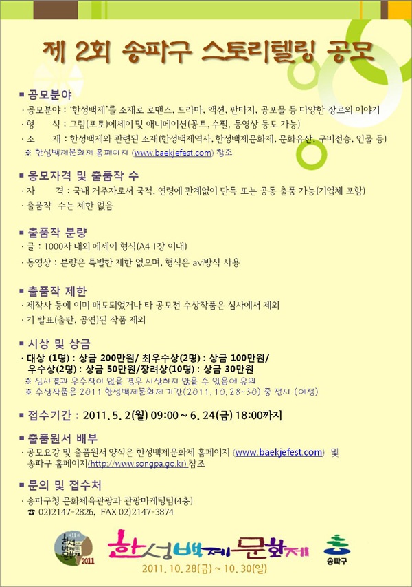 접 수 처 : 서울시 송파구 올림픽로 326(신천동 29-5) 송파구청 4층 문화체육관광과 관광마케팅팀