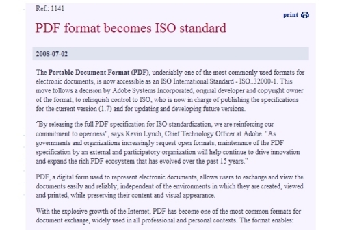 이는 pdf포맷을 개발한 저작권 소유자인 미국 '어도비시스템즈(adobe systems)'가 '국제표준화기구'에 pdf포맷에 대한 관리권을 양도로 인한 것으로, '국제표준화기구'가 pdf포맷 설계의 출판이나 업데이트에 책임을 가지는 것으로 하였다고 밝혔다.