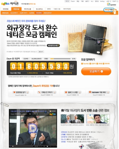 다음은 네티즌이 직접 모금 운동 발의부터 참여까지 스스로 진행하는 희망모금 캠페인을 통해 1866년 프랑스 함대가 약탈한 '외규장각 도서 297권'을 되찾기 위한 운동을 함께 펼쳐나갈 계획이다. 특히 이번 청원은 다음에 개설된 '위대한유산 공식카페 (http://cafe.daum.net/great74434)'의 게시판지기로 활동 중인 고등학생 네티즌(하얀방랑자)이 처음 청원을 제기하며 시작됐다.