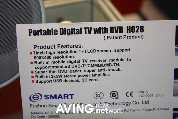 스마트(Smart)는 지난 12일부터 15일까지 홍콩 아시아월드엑스포에서 열린 중국 제품 전시 플랫폼 '차이나소싱페어(China Sourcing Fair) 2009 - Spring Edition'에서 디지털TV 시청이 가능한 휴대용 DVD플레이어를 선보였다.