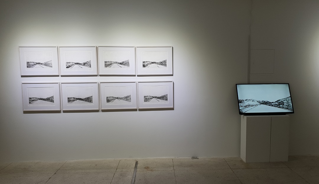 Road Trip, 2016, HD Moving Image, 28 Drypoint Prints, B/W, Sound, 5 sec. loop ©Design Jungle