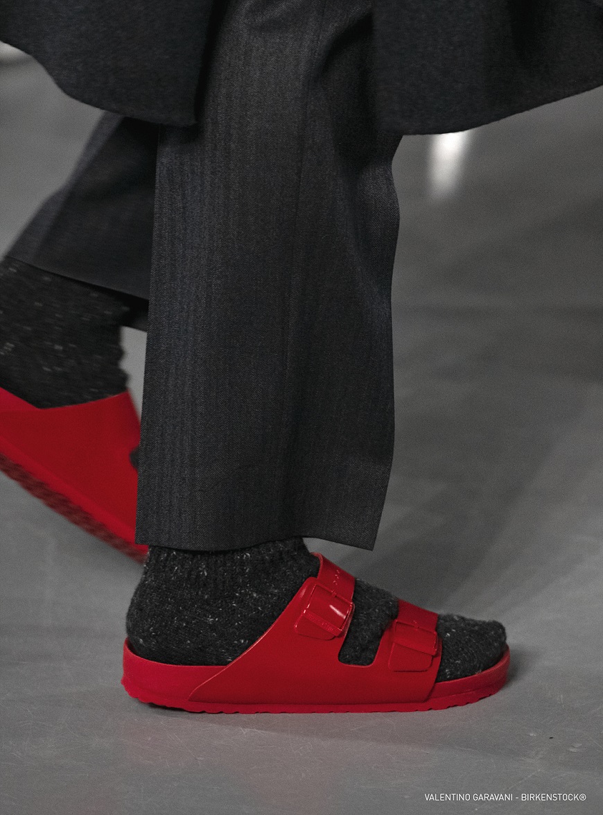 버켄스탁 특유의 코르크 밑창이 전부 가죽으로 만들어진 발렌티노 레드의 샌들과 옆면에 아이코닉 한 VLTN 로고가 부착된 블랙 컬러의 샌들까지 두 가지의 디자인으로 완성된 아리조나 샌들은 모델들에 의해 런웨이를 활보하며 이번 컬렉션 룩을 완성했다.