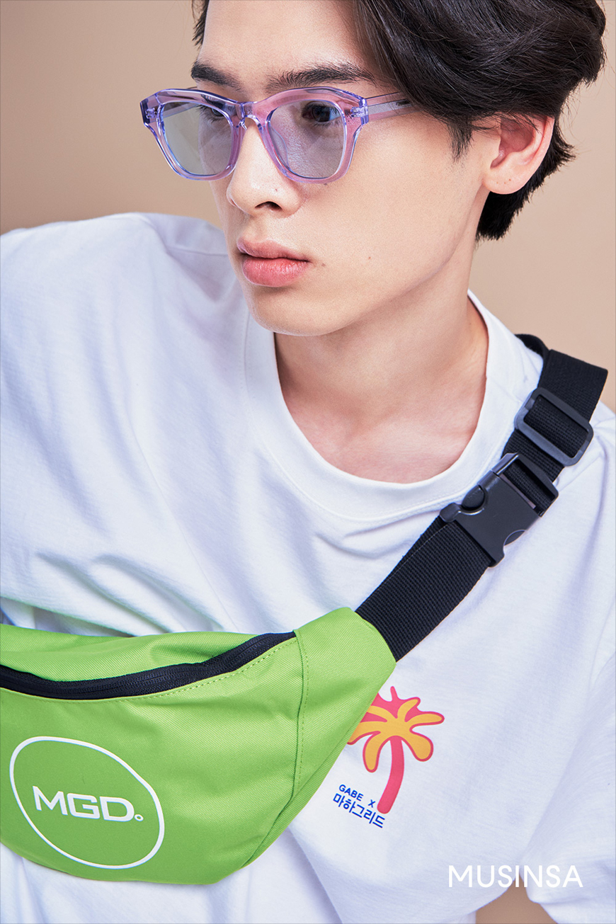 마하그리드와 가배의 이름을 한글로 넣은 특별한 티셔츠 MAHAGRID 39,000원, 리플렉티브 소재로 포인트를 준 라임 컬러 힙색 MAHAGRID 39,000원, 볼드한 프레임의 퍼플 컬러 선글라스 MUZIK 250,000원.