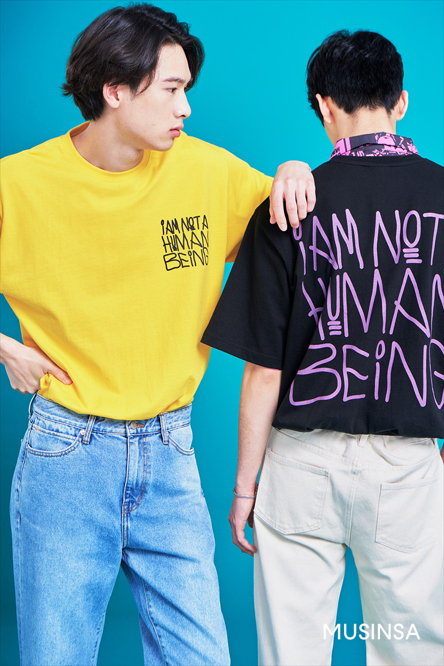 (영석)큼지막한 타이포그래피로 또렷한 개성을 더한 티셔츠 I AM NOT A HUMAN BEING 39,000원, 데일리 팬츠로 제격인 크림 컬러 팬츠 UNIIS DESIGN 75,000원.