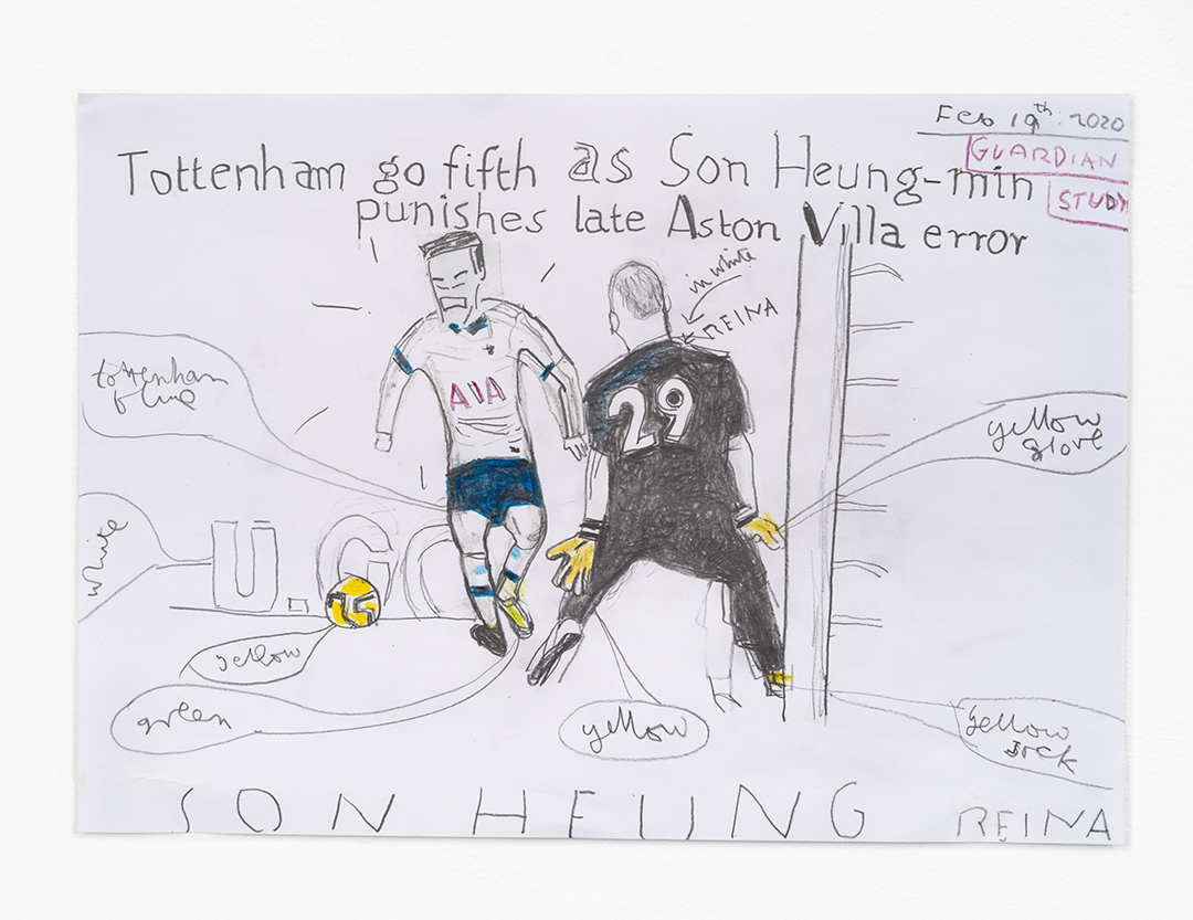 ⓒ Tottenham go fifth, 2020/ Rose Wylie, Pencil and colored pencil on paper, 21x29.7cm, Photo: Jo Moon Price(문현주).가디언지에 실린 신문기사를 바탕으로 손흥민 선수를 그린 작품이다.