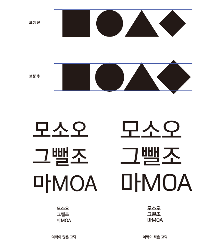 많은 초보 폰트 디자이너들이 디자인할 때 골격보다는 요소에만 집착하는 경우가 많습니다. CI, BI 레터링 작업을 하시는 분들도 마찬가지입니다. 기본기가 탄탄한 고딕에 다양한 요소를 더하면, 디자인의 표현력이 훨씬 향상됩니다.
