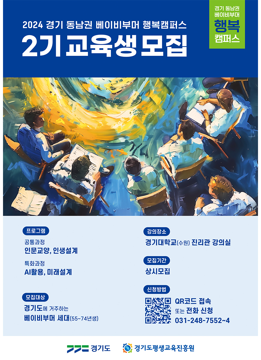 경기도평생교육진흥원이 베이비부머 세대(1955~74년생)의 성공적인 인생 2막을 위한 재도약과 사회참여 기회 확대를 지원하기 위한 '경기 동남권 베이비부머 행복캠퍼스' 2기 교육생을 모집한다.