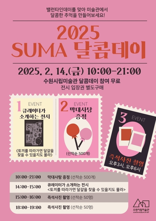 2월 14일 수원시립미술관 행궁 본관에서 열리는 ‘SUMA 달콤데이’는 미술관을 방문하는 관람객 선착순 500명에게 막대 사탕을 증정한다. 오후 2시에는 전시 ‘토끼를 따라가면 달걀을 찾을 수 있을지도 몰라’를 기획한 조은 큐레이터와 함께하는 전시 투어가 진행되며, 전시 해설 중에는 즉석 질의응답을 통해 미술관 경품도 제공된다. 오후 3시와 6시에는 시간별 선착순 50팀, 총 100팀을 대상으로 미술관에서 추억을 남길 수 있는 즉석 사진 촬영 행사가 마련된다.