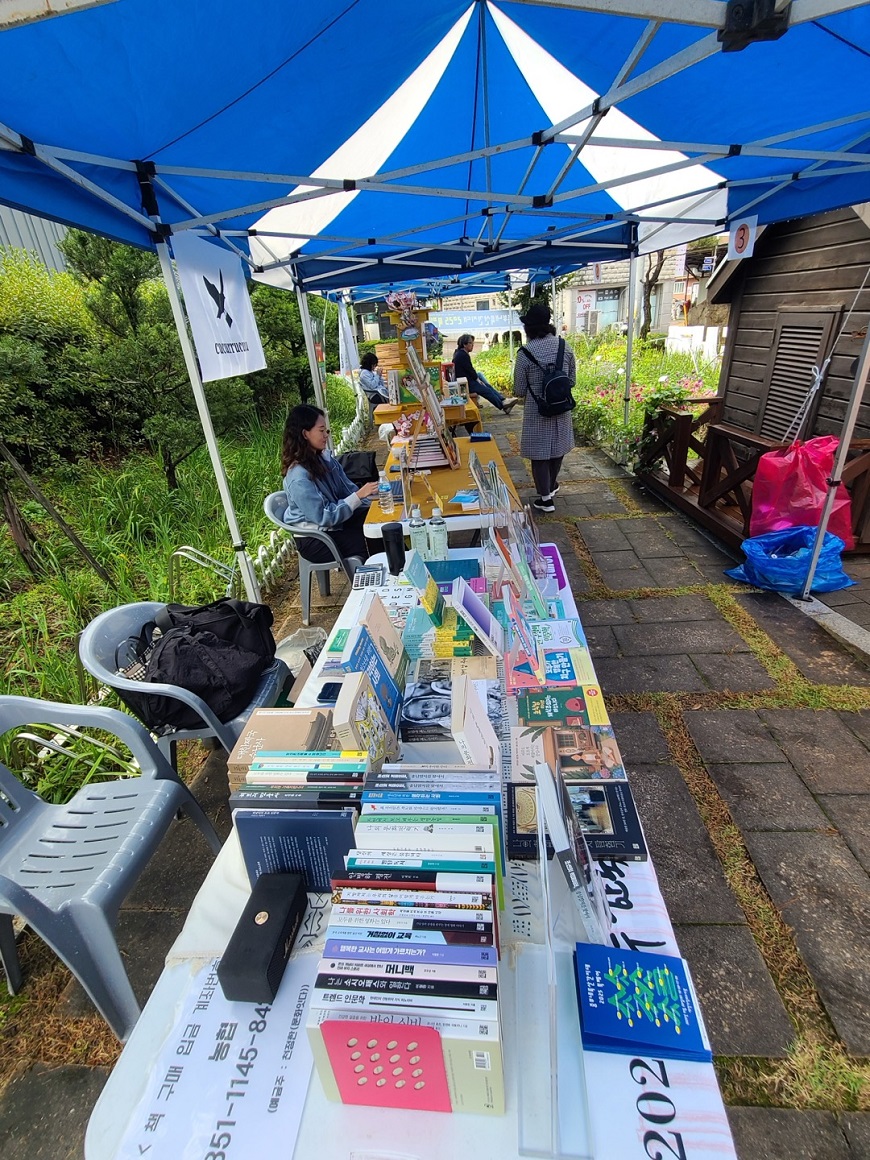 그동안 책방이나 출판사 이름으로 여러 행사를 벌였지만 그 일을 하는 개인들이 드러난 적이 없다는 아쉬움이 있어 홍보는 어쩔 수 없지만 각 부스엔 개인의 정체성을 내세우자 합의했습니다. 각 개인 소개 깃발과 문패를 부스마다 달고, 판매하는 책들도 개개인의 정체성을 담기로 했죠. 하여 겹치지 않게 협의, 일반 베스트셀러가 아닌 다양한 장르의 숨은 보석 같은 책들과 굿즈들을 선보였습니다.