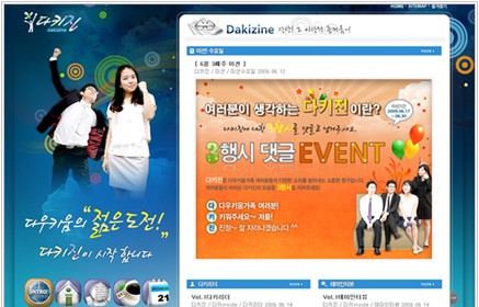 마케팅 커뮤니케이션 사업본부는 다우그룹의 내부 임직원을 위한 ‘다키진(dakizine)’웹진을 오픈했다. (주)다우기술을 시작으로 현재 총 11여 개의 계열사를 그룹으로 통합하여 기업 이미지를 전환하고자 하는 다우키움 그룹의 본 웹진은 격월 발간으로 연간 운영된다.