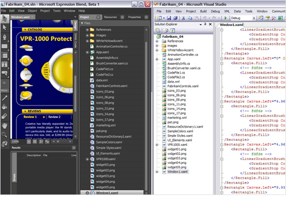 Expression Design 툴에서 가져온 XAML을 이용해 Expression Blend에서 조합하고 개체들에 대한 동작이나 다양한 속성들을 구현합니다. 마찬가지로 Expression Blend도 XAML로 이 기능들을 구현합니다. Expression Blend는 개발자와의 완전한 협업작업을 지원하며 XAML을 Visual Studio와 공유하기 때문에 디자이너의 디자인을 아무런 손실 없이 그대로 개발자에게 전달 가능합니다. 또한 Visual Studio와 완전히 같은 프로젝트 구조를 사용하기 때문에 다른 추가 작업 없이 지속적인 개발자간 협업이 가능합니다. 바로 XAML과 Expression 디자인 솔루션이 디자이너와 개발자간 완전한 협업을 가능하게 하는 것입니다.