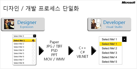 한국 Microsoft의 김대우 입니다. UX와 Silverlight에 대한 소개에 이어, 이번 시간에는 디자이너/개발자 협업을 지향하는 새로운 Microsoft의 디자인 솔루션을 소개해 드리려고 합니다. Silverlight 글에서 약속 드린 것처럼, Microsoft Expression Studio를 이용해 디자이너의 창조물을 그대로, 개발자가 어떻게 사용 가능한지, 이 작업의 전체적인 흐름과 절차가 어떻게 되는지 소개해 드리는 시간도 갖도록 하겠습니다.