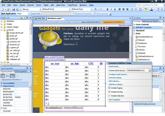 ASP.NET의 데이터 바인딩 기능을 웹 페이지 저작에서 통합한 화면