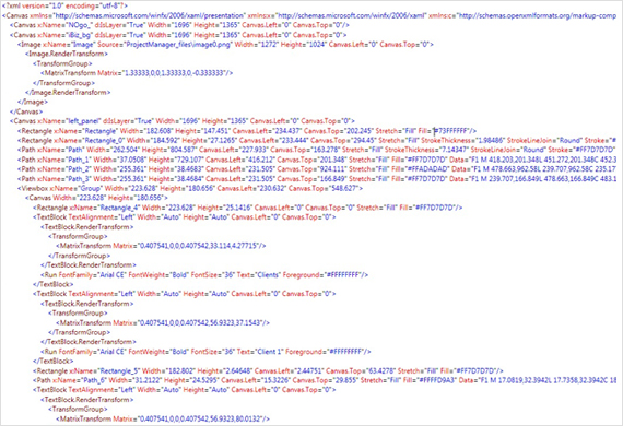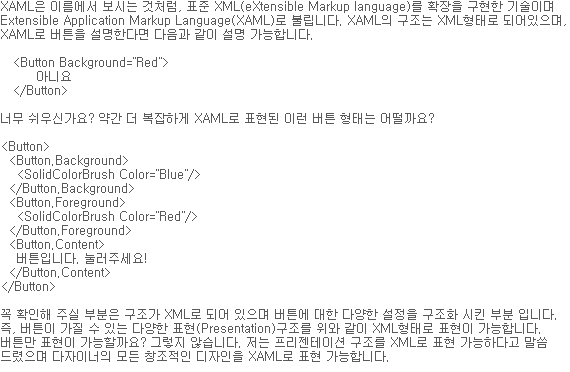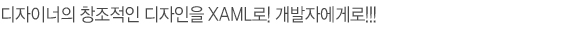 즉, XAML을 이용하면 모든 종류의 표현(Presentation)을 표준 XML구조의 텍스트 파일로 기술 가능하며, 개발자가 이 코드를 전달받아 개발 툴에서 이용 할 수 있다면? 완전한 디자인과 코드의 분리가 가능하고 우리 디자이너의 창조적인 결과물을 그대로 최종 결과물에서 사용 가능하게 됩니다. – 더 이상 디자이너와 개발자간 소통의 문제는 발생하지 않습니다!!!