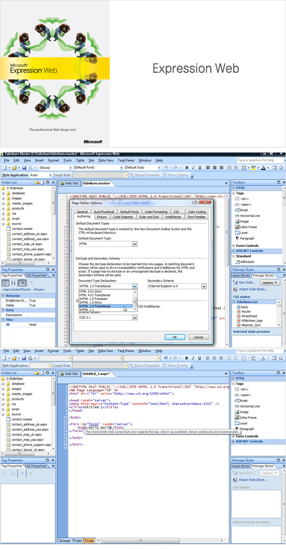 표준 기반 웹사이트 제작이 가능한 새로운 Microsoft의 웹페이지 저작 도구 입니다. CSS기반, XHTML1.0 기반 웹사이트를 기본적으로 지원합니다. 손쉬운 배포와 유지 관리가 가능한 장점이 있으며 HTML/XHTML/Strict/Transitional/Frameset and CSS 1.0/2.0/2.1을 기본적으로 지원하고 브라우저 특화 스키마 역시 지원합니다. 웹사이트에 대해서 자동적으로 CSS나 호환성 기능 등, 다양한 로직을 검사하는 루틴이 포함되어 있어서 표준 웹사이트 제작을 손쉽게 진행 가능한 장점이 있습니다. 특히 CSS 저작기능 강화로 최신 스타일의 CSS 레이아웃을 구현 가능하고, css의 속성들을 드래그 앤 드롭 기능으로 빠른 적용이 가능합니다. CSS가 적용된 페이지 디스플레이 및 저작 기술도 향상되어 새롭게 적용되거나 변경된 CSS를 페이지에서 직접 보면서 작업도 가능합니다.