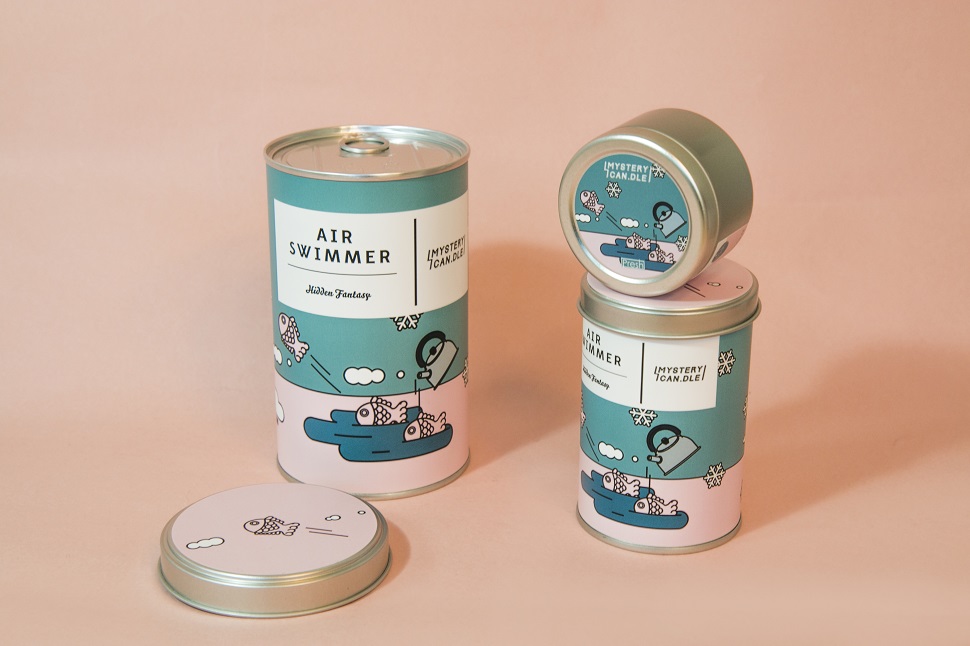 여름에 론칭한 티셔츠가 가을이 되자 판매가 주춤했다. 통조림을 활용할 수 있는 다른 아이템을 고민하던 중, ‘캔에 들어 있는 것? 아! 캔들’ 해서 캔들을 만들었다. 브랜드명은 MYSTERY CAN.DLE. 캔에 들어 있다는 것을 강조하기 위해 캔과 들 사이에 온점을 찍었다.