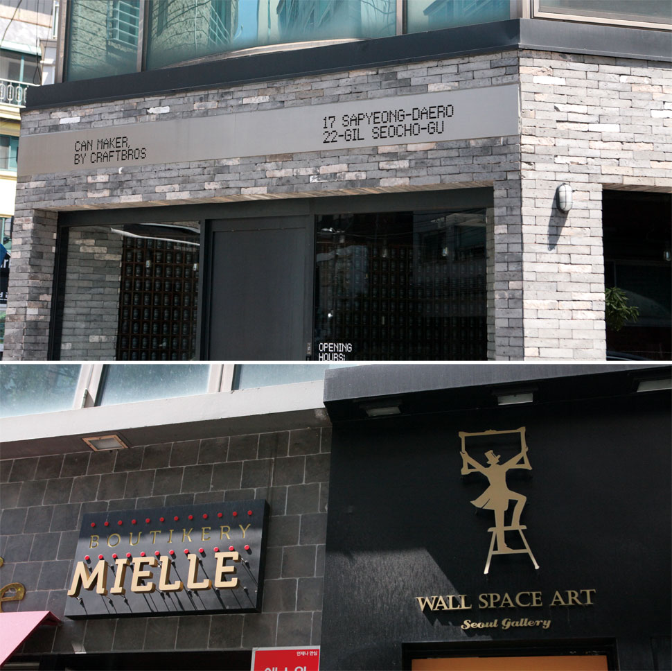 서초동의 서래마을은 마을 앞 개울이 서리서리 굽이쳐 흐른다고 해서 ‘서래마을’이라는 이름이 붙었다. 한적한 고급 주택가 틈틈이 위치한 카페와 레스토랑의 사인들은 너무 튀거나 화려하지 않아 고급스러운 거리 분위기와도 조화롭다. 인근에 위치한 방배동 사이길은 ‘방배로 42’라는 도로명에서 파생되었지만, 이곳에 입주한 예술가들이 방배사이길 예술거리 조성회를 운영하며 방배동 거리를 지나는 행인들과 예술과의 ‘사이’를 긴밀하게 하고자 하는 목적성을 내포하기도 한다. 사인의 규모 면에서는 차이를 보이지만, 파사드와 조화를 이루는 미니멀한 디자인이 돋보이는 두 거리를 걸어 보았다.