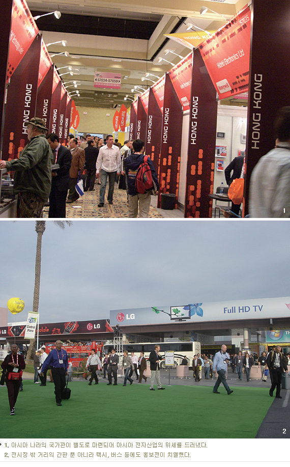 CES 전시장의 크기는 약 51만 평으로 대략 축구장 30개를 합한 것과 비슷하다. 이렇게 큰 전시장 가운데 하이라이트는 단연 중앙홀, 그것도 가운데 자리이다. 모든 전시가 마찬가지지만 자리가 중요하다. 중앙홀의 중심부에 들어서자 순간 삼성동 코엑스 전시장에 온 것이 아닐까 싶을 정도로 삼성, LG가 가장 좋은 위치에서 전시를 하고 있었다. 한국의 양대 가전 업체가 세계를 휩쓴다는 소문은 거짓이 아니었으며 한때 우러러보았던 일본의 전자 업체는 변두리로 밀려나거나 중앙홀이 아닌 아예 다른 건물에서 전시하기도 했다. 현명한 해석은 아니지만 2007 CES 전시장 자리싸움에서 괜찮은 아랫목을 차지한 기업은 삼성, LG, 소니, 파나소닉 그리고 샤프 정도 정도다. 그 옛날 흑백 TV를 미국에 OEM으로 납품하던 우리 업체가 이런 자리에 섰다는 것이 감개무량하다.