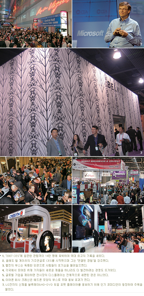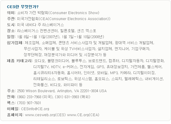 2007년 1월 초 미국 라스베이거스에서 세계 최대의 전자박람회 CES(Consumer Electronics Show)가 막을 내렸다. 그동안 CES에서 처음 선보인 전자제품들은 인류의 역사가 되곤 했다. 1970년 VCR, 1981년 CD 플레이어, 2001년 플라즈마 TV 등 당시에는 참신한 첨단 제품이었지만 지금은 생활의 일부가 되어 있다. CES는 과연 우리에게 어떤 의미이고, 특히 디자이너로서 어떻게 받아들여야 할까?