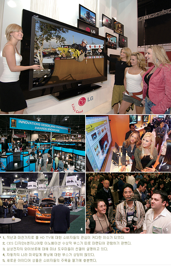 올해 CES 키워드는 ‘콘텐츠, 기술 그리고 그 사이의 모든 것’이었다. CES를 주관하는 CEA의 사피로 회장은 “이제 단순히 하드웨어만이 아닌 콘텐츠와 융합된 컨버전스 가전시대가 도래했다”고 말하면서 주제를 구체적으로 다시 한번 환기시켰다. 이번 전시에서도 중국의 하이센스가 IP TV(Internet Protocol TV: 인터넷 회선을 TV 수상기에 연결하여 무한 채널에 접속 가능케 하는 TV)를 선보였다. 이제 가장 강력한 하드웨어와 무궁무진한 소프트웨어의 만남은 시간문제인 것 같다. 역시 인간은 TV를 발명한 이래 TV를 통해서 소통하고 소비하는 것을 가장 쉽고 편하게 여기는 것 같다. 빌 게이츠는 최근 “앞으로 5년 뒤 사람들은 우리가 현재 TV를 보는 방식에 대해 웃음을 금치 못할 것”이라고 말했다. 전문가들은 인터넷과 TV의 결합이 불러올 ‘TV 혁명’이 시청자의 역할을 근본적으로 바꾸어놓고, 기존 TV 광고 시장과 콘텐츠 유통 구조도 위협받을 것으로 전망하고 있다. 한국은 초고속 인터넷 보급에서는 세계 최고이지만, IP TV에 관해서는 아직 그 개념조차 모르는 사람이 많다. CES에서는 1998년 HD TV, 2001년 플라즈마 TV, 2005년 IP TV가 처음 소개되었는데, TV의 진화가 과연 어디까지 갈지 궁금하기도 하다.