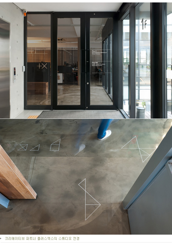 저희는 2010년 7월 24일, 5명이 책상 6개를 갖고 시작했습니다. 7개월의 시간동안 7명에서 21명으로 직원이 늘어났고 일을 하는데 있어서 좀 더 나은 환경을 만들기 위해 3월 12일 새로운 곳으로로 이사를 했습니다. 총 25명의 자리가 있는 플러스엑스의 사무실은 생각보다 넓지 않습니다. 넓은 공간을 시원하게 쓰는 것보다 작은 공간을 효율적으로 활용하고 많은 물건들을 효과적으로 수납하는 효율적 공간분할이 필요했습니다. 전체적인 공간의 디자인에 있어서 ‘플러스엑스다움’을 찾기 위해 그래픽 아이덴티티를 디자인하고 공간디자인에 +와 X의 모듈을 적용했습니다. 플러스엑스는 자체적인 디자인컬러를 추구하지 않습니다. 한마디로 저희는 컬러가 없음을 추구하는데 이러한 회사의 기조 때문에 공간과 아이덴티티에 블랙과 화이트 그리고 자연 자체의 컬러인 나무만을 사용했습니다. 소재는 아연판, 구로철판, 티크원목, 파벽돌을 사용하였습니다.