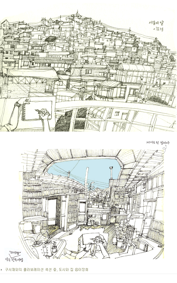 그를 만난 곳은 광화문 교보문고 안에 위치한 ‘구서재(九書齋)라는 매장에서였다. 조선시대 실학자 이덕무의 서재 이름을 차용했다는 이 곳은 매달 테마를 달리하여 공간을 구성하는 일종의 편집매장. 이장희는 구서재의 6월 테마를 담당한 콜라보레이션 작가이다. 자연과 도시, 집과 회사, 문화공간과 여행, 건축과 가상공간, 그리고 특별한 공간에 이르기까지 작가의 섬세한 화풍으로 표현된 아홉 가지의 테마는 서점이라는 공간이 지닌 차분함과 어우러져 독특한 매력을 발산하는 듯 했다.