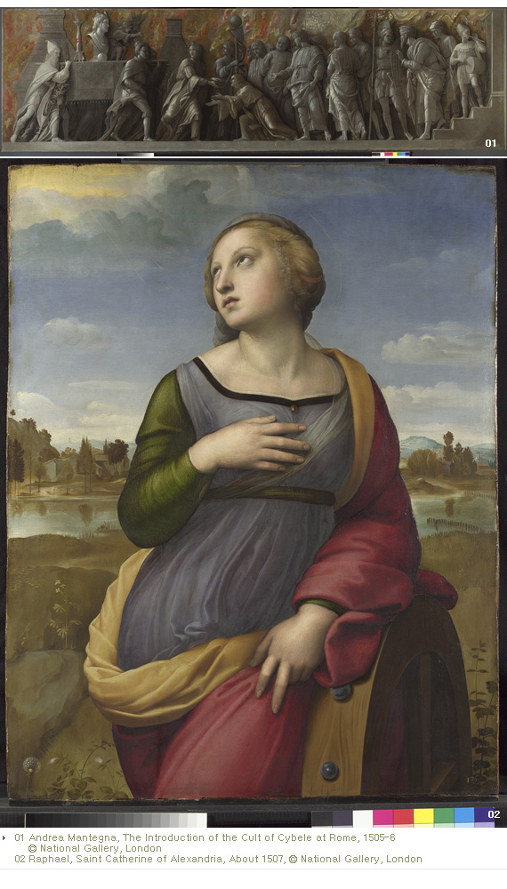 1989년 Riley는 The Artist’s Eye라는 전시를 위해 내셔널 갤러리가 소장하고 있는 두 거장의 작품을 선택한다. 하나는 Andrea Mantegna의 The Introduction of the Cult of Cybele to Rome (1505-06) 이고, 다른 하나는 Raphael의 Saint Catherine of Alexandria (about 1507) 이다.