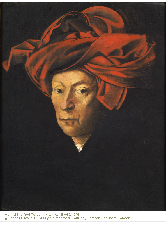 실제로 Riley는 그녀의 학생 시절에 존경하는 예술가들의 작품을 따라서 많이 그렸다고 한다. 그 그림들을 모방하면서 그 예술가가 쓴 선과 색, 구성 등 모든 것 들을 느끼려고 노력했다고. 그녀의 첫 번째 모방 작품은 1433년에 그려진 Jan Van Eyck의 Portrait of a Man (Self Portrait?) 이다.