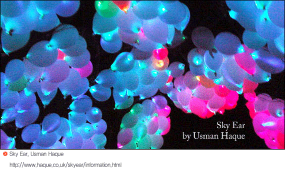 상상만으로도 가슴 설레는 일이다. Usman Haque의 Sky Ear는 대략 천 개의 풍선 더미들을 구름형태로 연결시켜 하늘에 띄우는 이벤트로, 핸드폰으로 구름에게 전화를 걸어 하늘의 소리를 듣는다는 것이 작가의 기본 컨셉이다.