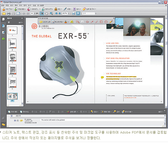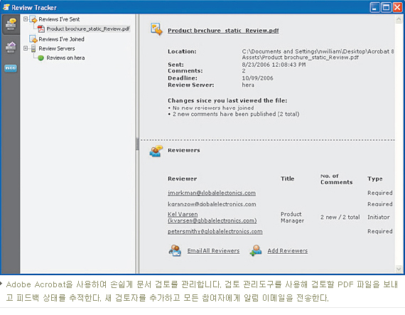 강력한 문서 검토 시작, 관리 및 추적 도구를 사용하여 피드백 및 승인 시간을 단축할 수 있다. Adobe Reader¹ 사용자는 문서 검토에 참여할 수 있다. 검토자는 스티커 노트, 스탬프, 강조 표시, 연필, 취소선, 설명선, 치수선, 모양 및 구름 도구와 같은 친숙한 주석 달기 도구를 사용하여 Adobe PDF 파일을 검토 및 마크업 할 수 있다. 피드백을 하나의 PDF 파일에 취합하여 주석을 조정할 수 있다.