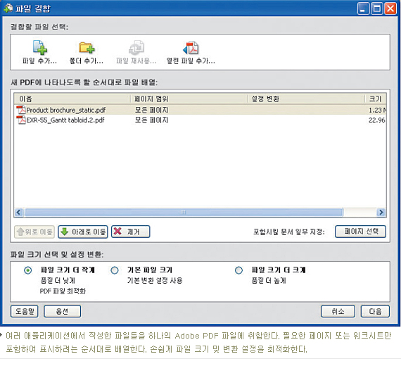 문서, 스프레드시트, 프레젠테이션, 전자우편, 웹페이지, 양식를 손쉽게 하나의 Adobe PDF 문서로 결합한다. 파일 유형, 용지 크기 또는 방향에 관계 없이 선호하는 순서대로 파일을 표시할 수 있다.