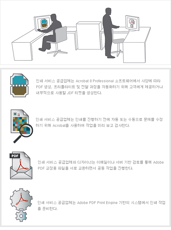 인쇄 서비스 공급업체는 Acrobat을 사용하여 중복 인쇄 미리 보기, 가는 선 규칙, 잉크 사양 등을 확인하여 작업을 사전에 검사할 수 있으며, 언제든지 하드/소프트 교정용 파일을 생성하여 고객과 공유할 수 있고 고객은 Acrobat 또는 Adobe Reader 소프트웨어에서 이 파일을 확인하고 주석을 달 수 있다.