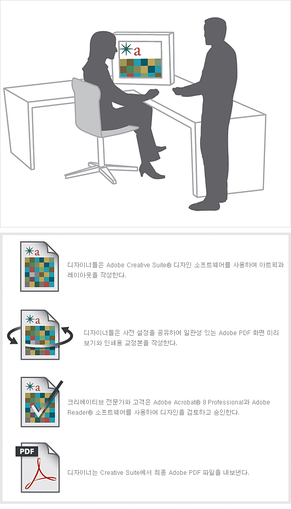 전체 Adobe PDF 워크플로우는 Adobe Creative Suite로 시작된다. 디자이너는 Adobe Illustrator®, Adobe Photoshop®, Adobe InDesign® 소프트웨어 등 해당 패키지의 구성 요소들을 사용하여 투명 효과, 별색, 사용자 정의 색상 등 세련된 그래픽이 포함된 리치 컨텐츠를 제작할 수 있으며 최신 RIP 엔진을 사용하는 동일한 핵심 기술을 통해 Adobe PDF에서 디자인을 미리 보고 교정할 수 있으므로 해당 효과는 의도한 모습 그대로 출력된다. 디자이너는 정확한 PDF 미리 보기 및 교정 인쇄 기능을 통해 초기 단계에서 발생할 수 있는 인쇄상의 문제를 확인하고 처리할 수 있으므로 제작 과정 중에 변경 사항을 최소화할 수 있다. 따라서 디자이너는 돌발 상황을 미연에 방지하고 작업 속도를 높이며 창의적인 부분에 집중할 수 있는 것은 물론, 자유자재로 디자인 도구를 사용하여 자신의 역량을 최대한 발휘할 수 있는 것이다.