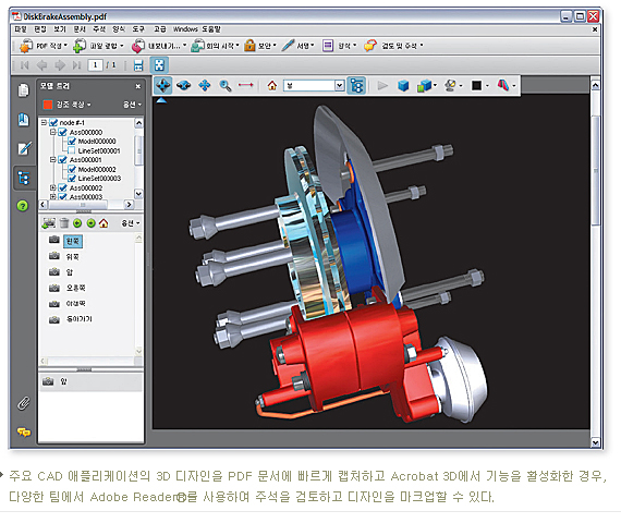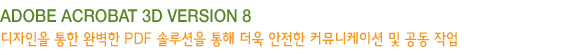 Adobe Acrobat 3D Version 8 소프트웨어에서는 PDF 문서를 통해 많은 팀원들이 안전하게 공동으로 3D 디자인 작업을 할 수 있도록 디자인 엔지니링 전문가와 기술 출판 전문가를 제공한다.