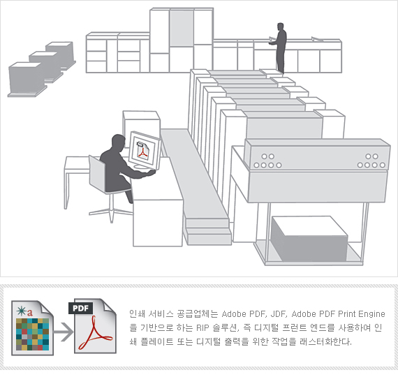작업의 제작 준비가 완료되면 인쇄 서비스 공급업체는 Adobe PDF Print Engine을 기반으로 하는 워크플로우 시스템, 즉 디지털 프런트 엔드에서 해당 작업을 래스터화할 수 있다. 색상 변환, 투명도 처리, 트랩핑, 정판 모두가 RIP에서 발생한다. 긴밀하게 통합된 렌더링 기능과 확장 가능한 아키텍처를 통해 PDF 파일을 보다 빠르게 처리할 수 있으므로 인쇄 서비스 공급업체는 작업 소요 시간을 줄이고 보다 높은 수익을 기대할 수 있다.