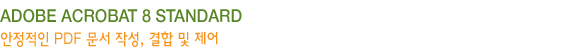 Adobe Acrobat 8 Standard 소프트웨어를 통해 쉽고 안전하게 Adobe PDF 문서를 작성, 결합 및 제어하고 더욱 안전하게 배포 및 공동 작업을 수행할 수 있다.