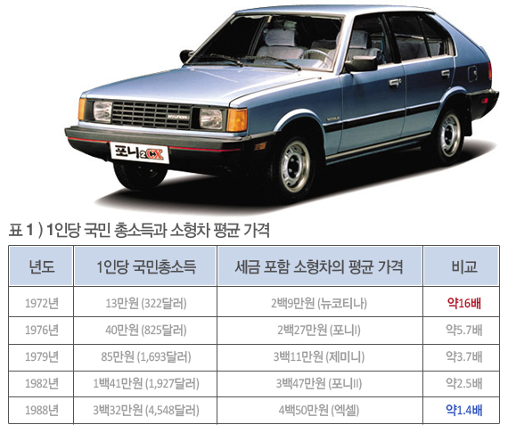 자동차를 구매하는 사람이 지속적으로 증가해 온 것에 비해, 자동차 보유대수는 80년대 초반까지도 인구수에 비해 상당히 낮았다. 81년 승용차 1대당 인구수는 144.7명으로 이러한 낮은 보급률은 높은 차량 가격에 있었다. 소형차의 가격(과세전)은 한국보다 국민소득이 월등히 높은 일본에 비해 4%, 미국에 비해 16%가 비쌌으며, 레코드 급의 중형차는 일본보다 31%, 미국보다 45%정도 더 비쌌다. 당시 포니의 국산화 비율은 96%에 달했지만, 고급차일수록 국산화율은 60% 내외로 떨어져 수입하는 부품 비용 때문에 차량 가격이 더 높을 수밖에 없었다. 공업화의 수준, 차량 가격, 소득, 관세율, 도로, 기타 주차시설 등 자동차의 대중화에 영향을 미치는 요인은 많지만, 그중에서도 가격은 가장 중요한 문제였다. 위의 표에서 보듯이 80년대 초반까지만 해도 자동차는 GNP의 몇 배에 달하는 고가의 물건이기 때문에 일부 상류층만이 구매할 수 있었다.