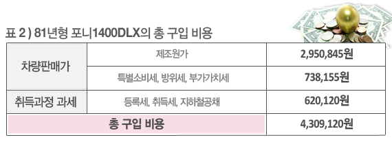 생산비뿐만 아니라 세금도 자동차의 비싼 가격에 한 몫을 했다. 사람들은 자동차 자체의 가격보다 차량 구입에 따른 세금을 더욱 부담스럽게 여겼다. 자동차를 구입하기 위해서 내야하는 세금만 해도 특별소비세, 방위세, 부가가치세, 취득세, 등록세, 자동차세, 지하철공채, 면허세 등 그 세액은 일본의 6배, 미국의 30배에 달했다. 81년도 동아일보 기사에 따르면 370만원의 포니 1400DLX(옵션포함)를 구매하는 데 드는 총 비용이 4백30만원이었고, 이중 31.5%인 1백35만원은 제세공과금이었다.