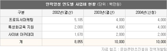 사업 현황 및 경과를 보면 ‘프로듀서·마케터 교육과정’과 ‘특성화 교육 지원’, ‘사이버 아카데미’로 크게 세 가지 분야로 나누어 볼 수 있다.