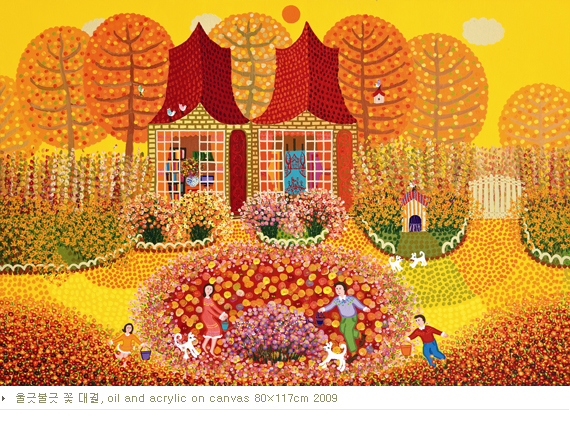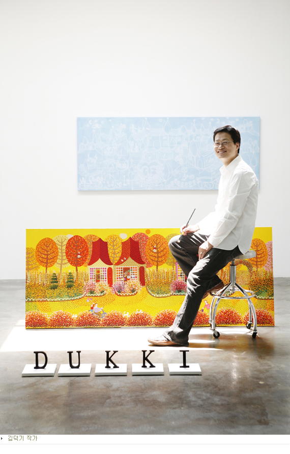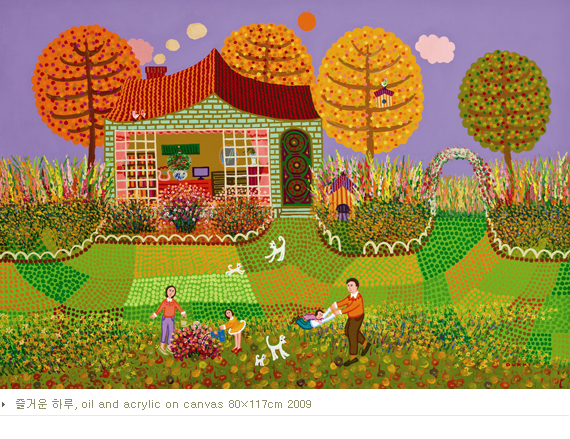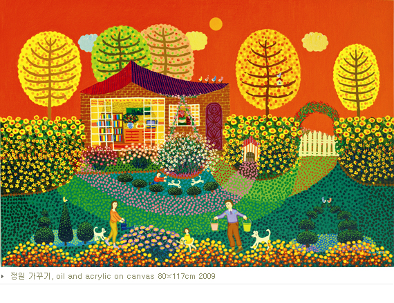 화면은 발랄하고 명랑한 색으로 가득 차 있다. 꼼꼼하게 그려놓은 지붕 아래로 테이블이며 가구들이 보인다. 단풍이 든 나무들에는 작은 새장이 있고 집 앞 작은 화단에는 화사하게 꿏들이 피어있다. 꽃밭에 물을 주는 가족이 보이고 뛰어노는 하얀 강아지들도 네 마리 보인다. 성실하게 그린 아이의 그림처럼 순수함이 느껴지는 이 그림은 작가 김덕기의 그림이다. 줄곧 집과 가족을 그려온 그의 그림은 밝고 화려한 이미지와 색감, 아이같은 천진한 드로잉이 특징이다. 처음 그의 작업을 보았을 땐 키치나 빈티지 풍을 염두한 팝적 작업에 속하는 것인가 하는 틀에 박힌 ‘이즘’에 대한 정리? 혹은 정의 욕구가 앞섰지만 이내 곧 그의 작업이 그 어떠한 이즘이나 형식과는 관계없이 솔직하고 착한 감성으로 이루어진 것이라는 사실을 깨닫게 되었다.