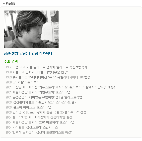 홈페이지에 올린 그의 몽환적이면서도 동화적인 향기가 물씬 묻어나는 그림들이 많은 사람들에게 사랑을 받았기 때문이다. 이제는 컨셉 일러스트 분야에서 '잠산' 이라는 그의 애칭을 모르는 사람이 없을 정도가 되었다.