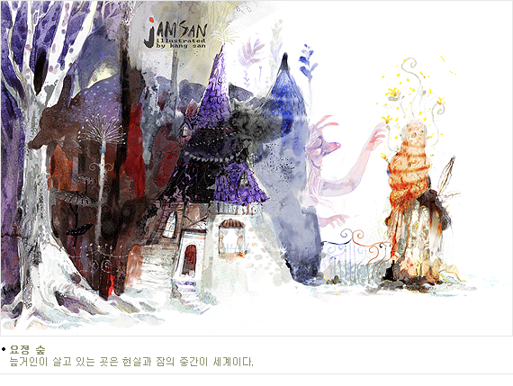 맨 처음 '잠산'의 탄생은 그렇게 시작이 되었지만, 요즈음에는 내가 만든 캐릭터들이 모여 사는 곳을 '잠산'이라고 부르고 있다. 현실과 잠의 중간 세계를 표현하기에 이보다 좋은 표현을 발견할 수 없기 때문이다. '잠산월드'에는 내가 꿈속에서 보았던 수많은 신비로운 동물들과 환상적인 세상이 존재하고 있다.
