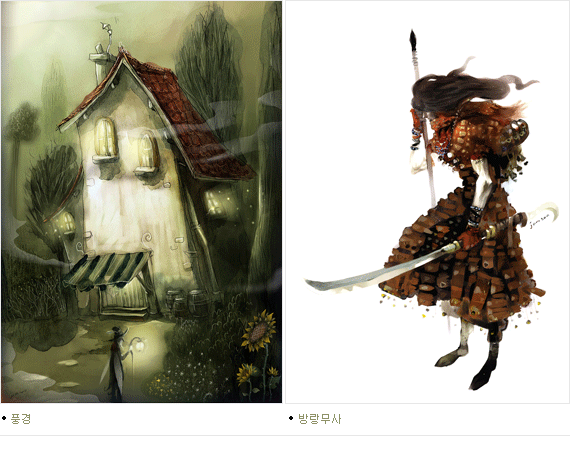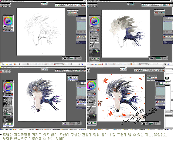 손으로 그림을 그리는 것에 익숙했던 내가 컴퓨터를 배우게 된 것은 무엇보다 머리속의 다양한 생각과 상상을 빠른 시간 안에 눈에보이는 이미지화 시킬수 있었기 때문이다.이것이 컴퓨터가 페인터가 가진 가장 큰 장점이라 생각한다, 기존의 컴퓨터 작업이 기계적인 느낌이 들었다고 한다면 나는 페인터를 이용하여, 손 맛 나는 자연스러운 느낌을 그리고자 노력했다.