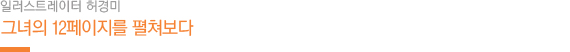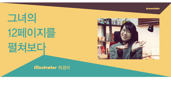 일러스트레이터 허경미도 어쩌면 제 안에 두꺼운 책을 숨기고 있는지 모르겠다. “사진 찍히는 게 너무 어색해서…”라며 웃는 얼굴에서 쑥스러움 잘 타는 소녀의 모습이 묻어난다(고운 피부도 여기에 한몫을 한다). 그런가 하면, 일러스트 작업과 삶을 이야기할 때에는 특유의 큰 눈이 초점 한 번 움직이지 않고 상대방을 응시한다. 대화가 계속될수록, 그녀 안의 책장이 한 장씩 넘어가는 듯하다.