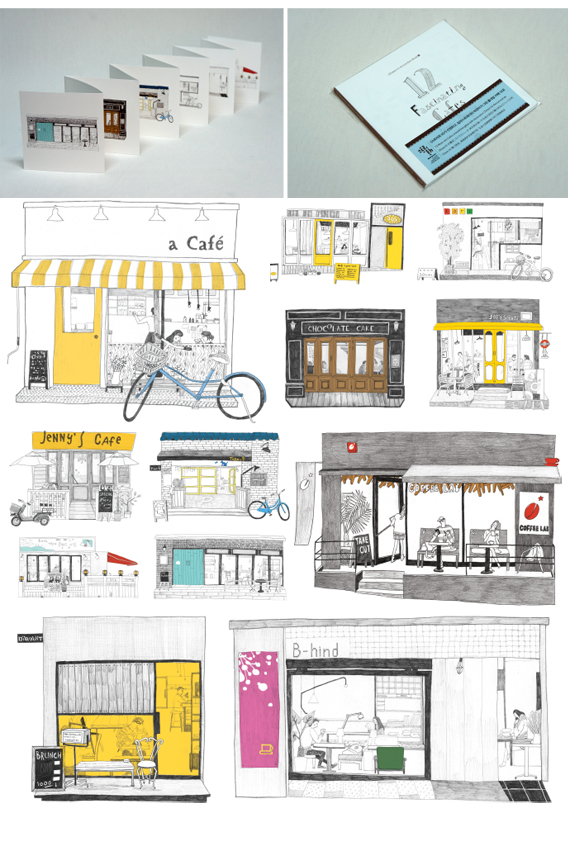 “아코디언 북에 실린 어 카페(A Cafe)는 내가 평소에 좋아했던 곳이다. 특히 노란색 차양이 무척 예쁘다고 생각했었다. 그런데 막상 일러스트로 표현하려고 세밀히 뜯어보니, 병아리 같은 노란색이 아니라 상아색에 가까운 흐릿한 빛깔이더라. 창문 모양도 내가 평상시에 무심코 보던 것과는 전혀 달랐다. 눈으로 본 카페는 손으로 그려질 때 전혀 다른 느낌이다. 12곳 카페들을 그릴 때 이런 점들을 하나하나 다 헤아렸다. 카페 한 군데당 세 컷씩 그려본 끝에 완성작이 나올 수 있었다.”