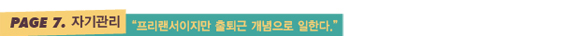 “작업실에서는 오직 작업만 한다. 여가는 집에서만 즐긴다. 내 철칙이다. 집과 작업실을 분리해놓지 않으면 내가 나를 통제하기 힘들어진다. 일부러 집과 멀리 떨어진 곳에 작업실을 구한 이유이기도 하다. 직장생활을 하면 회사의 타임테이블에 나를 맞추면 되지만, 프리랜서로 일하면 그런 외부적인 제어 장치가 없다. 그래서 더 스스로에게 엄격해질 수밖에 없다. 프리랜서이기는 하지만, 출퇴근 개념으로 늘 일하고 있다.”