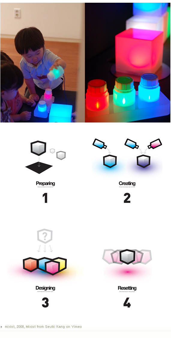 사람들에게 빛으로 원하는 색을 만드는 과정에서 색다른 경험으로 주고 싶었어요. 스위치에 대한 사전적인 의미도 바꿔보고 싶었고요. 우리가 불을 켜고 끌 때 꼭 스위치를 켜야만 하는 게 아니고, 빛도 물처럼 따라볼 수 있고, 그런 행위가 놀이나 경험의 확장이라고 생각해요. 재미있었던 경험 중 하나가 전시회 때 아이들이 믹시시트를 갖고 서로 하겠다고 싸움이 날 뻔했는데, 색을 섞으면서 엄청나게 고민하면서 집중을 하더라고요. 아이가 그걸로 어떤 생각을 했는지 모르지만 한참을 바라봤던 기억이 나네요.