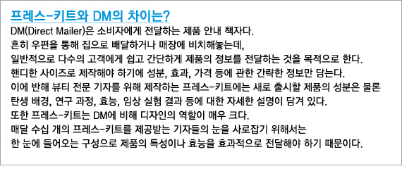 요즘 백화점에서 흔히 구할 수 있는 뷰티 브랜드의 카다로그, 집으로 배달된 코스메틱 브랜드의 DM(Direct Mailer)은 어쩐지 한 번 보고 버리기 아까울 정도다. 그만큼 디자인이 잘 되어있기도 하고, 신제품 정보 등 다양한 읽을 거리도 제공하기 때문. 해당 브랜드의 이미지 제고에도 한 몫 단단히 하고 있는 DM과 프레스킷을 유명 뷰티 브랜드를 중심으로 둘러본다. 다수의 글로벌 뷰티 브랜드의 홍보물을 제작해온 디자인그룹 헤즈(HEAZ)의 친절한 설명을 곁들여 첫 번째로 살펴본 브랜드는 바비브라운(BOBBIBROWN)과 크리니크(CLINIQUE)다.