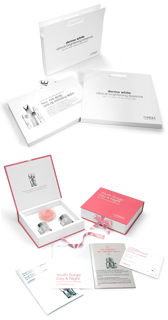 크리니크의 프레스-키트 디자인 작업 중에서 가장 신경 쓴 부분은 호기심을 자극할 수 있을만한, 독특한 아이디어를 찾아내는 것이었다. 브랜드가 가지고 있는 전문적이고 신뢰할 수 있는 이미지를 그대로 옮기는 동시에, 타깃 층인 담당 기자들에게 콘셉트를 확실하게 전달할 수 있도록 임팩트 있는 아이디어의 활용을 염두에 둔 것.